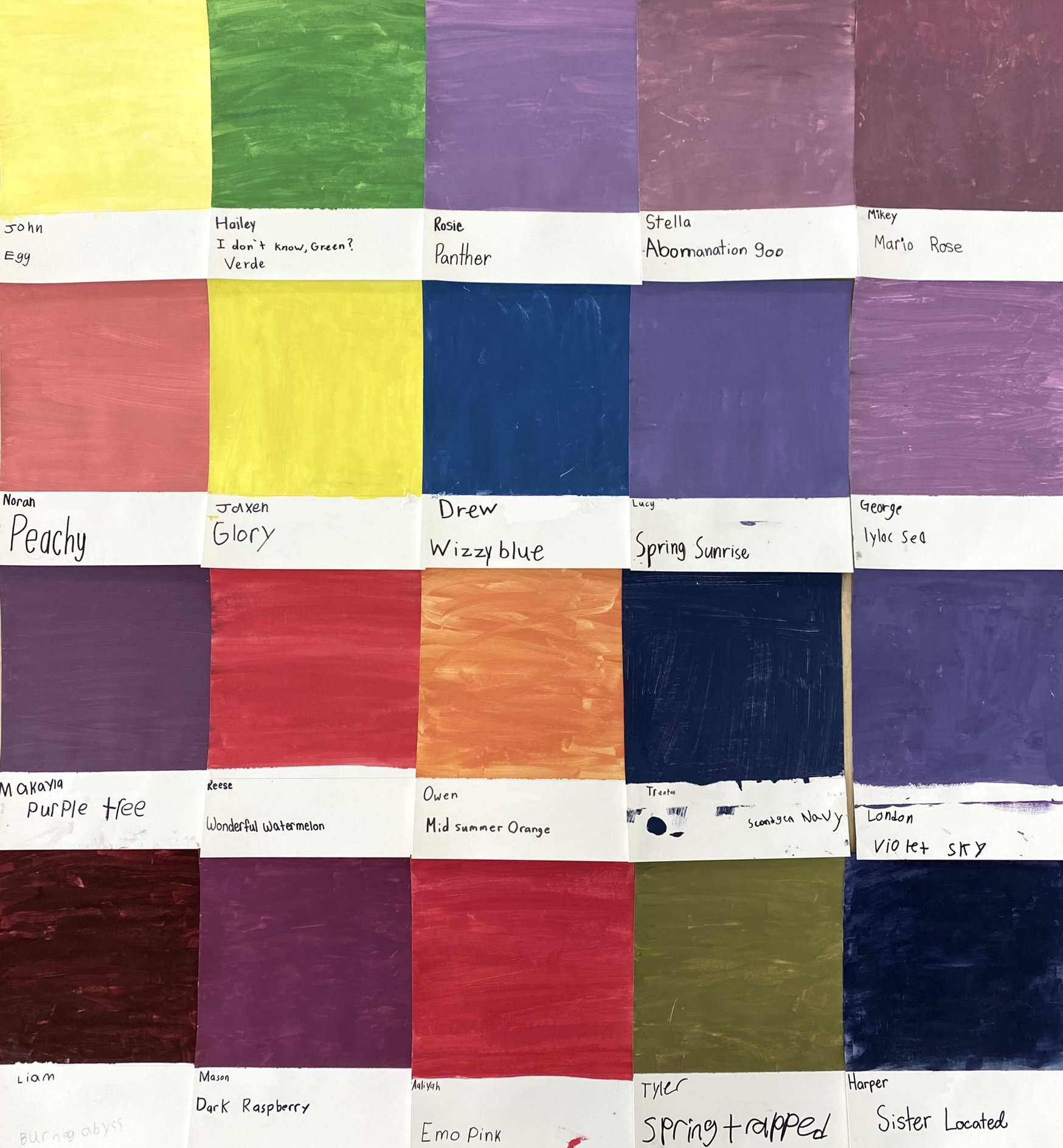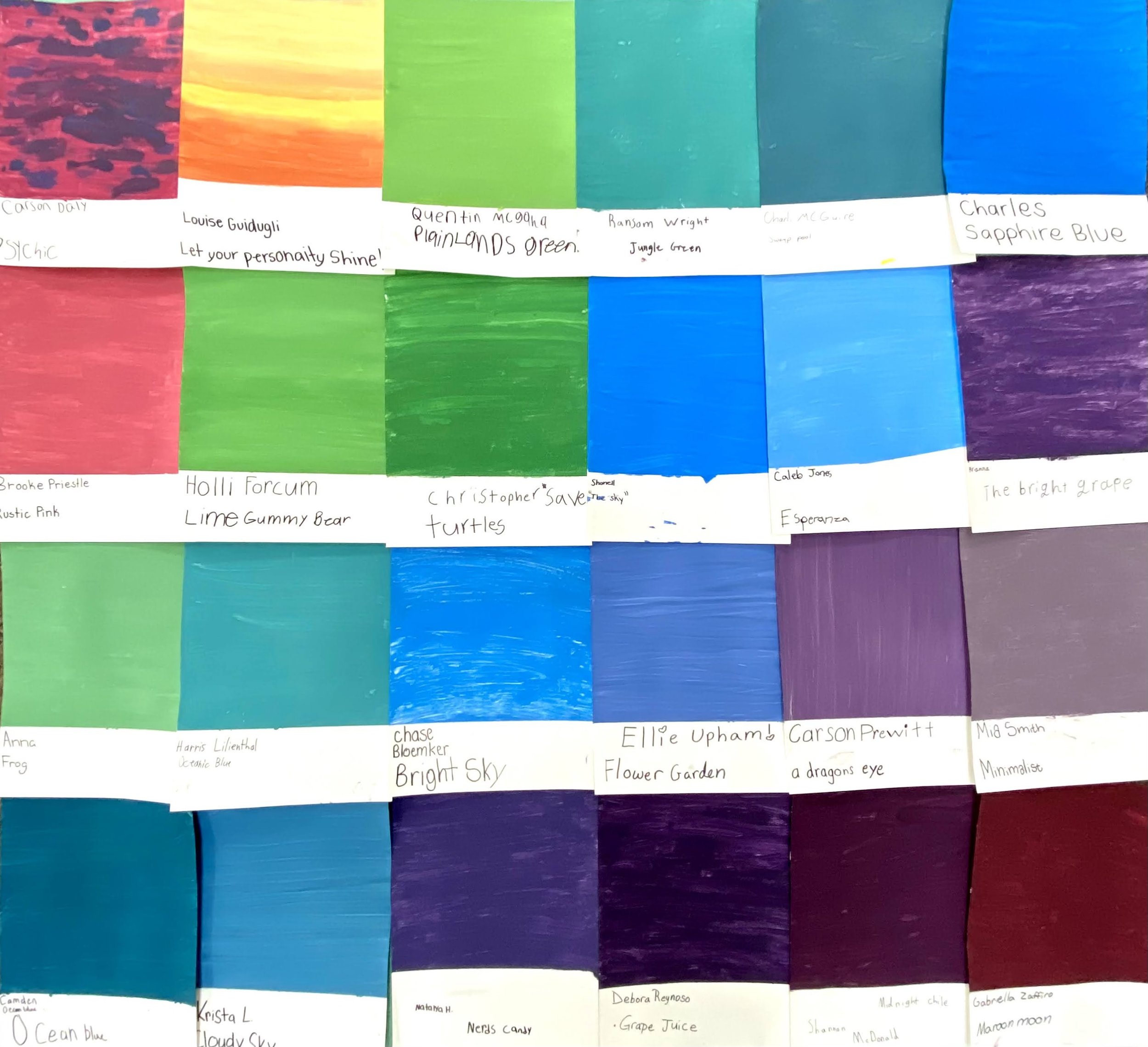 A brief but creative project that challenges 6th grade students to invent, name, and reflect upon their own Color of the Year. This lesson is grounded in Pantone’s annual selection of a color that represents the year to come. This context helps students to understand the value of color coding in the field of design and the emotional connotations behind a hue. Students used a mixture of red, yellow, blue, black, and white paint to develop their own unique color. Reflecting on their results, they gave their Color of the Year a creative name to represent its mood.