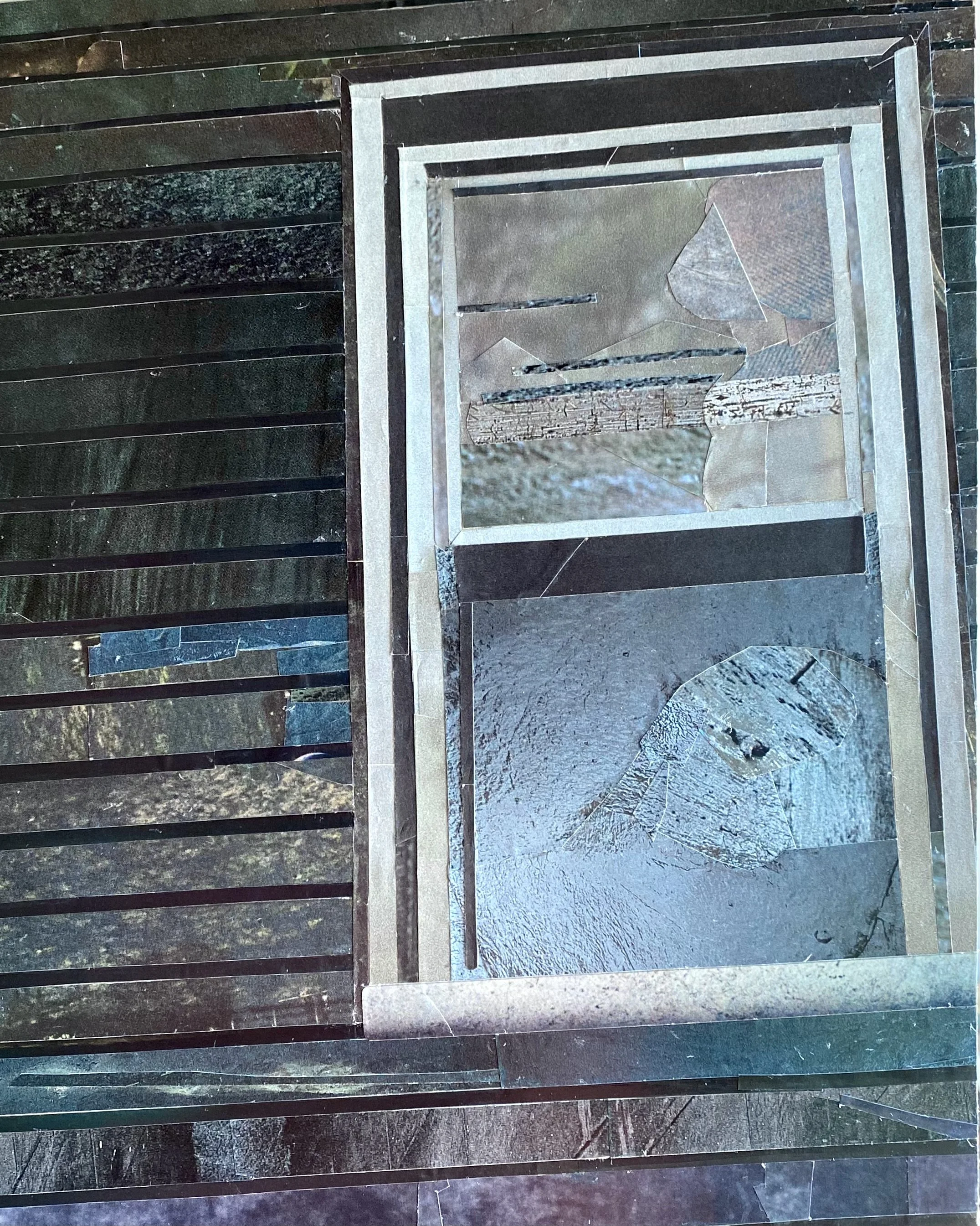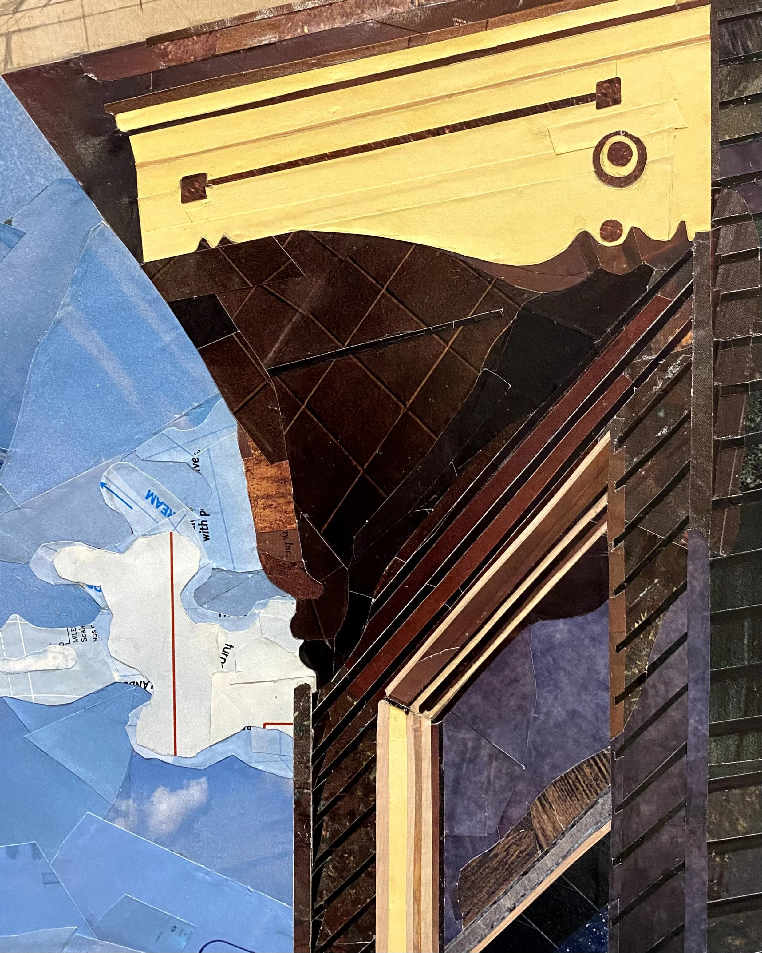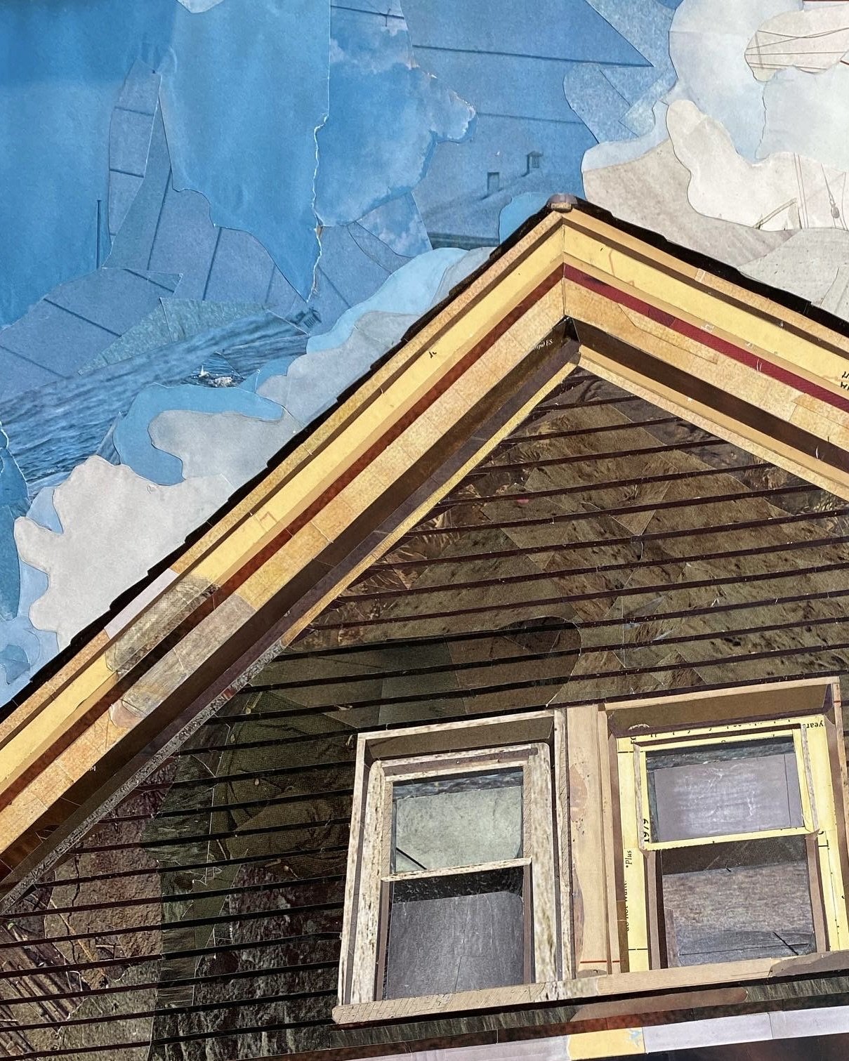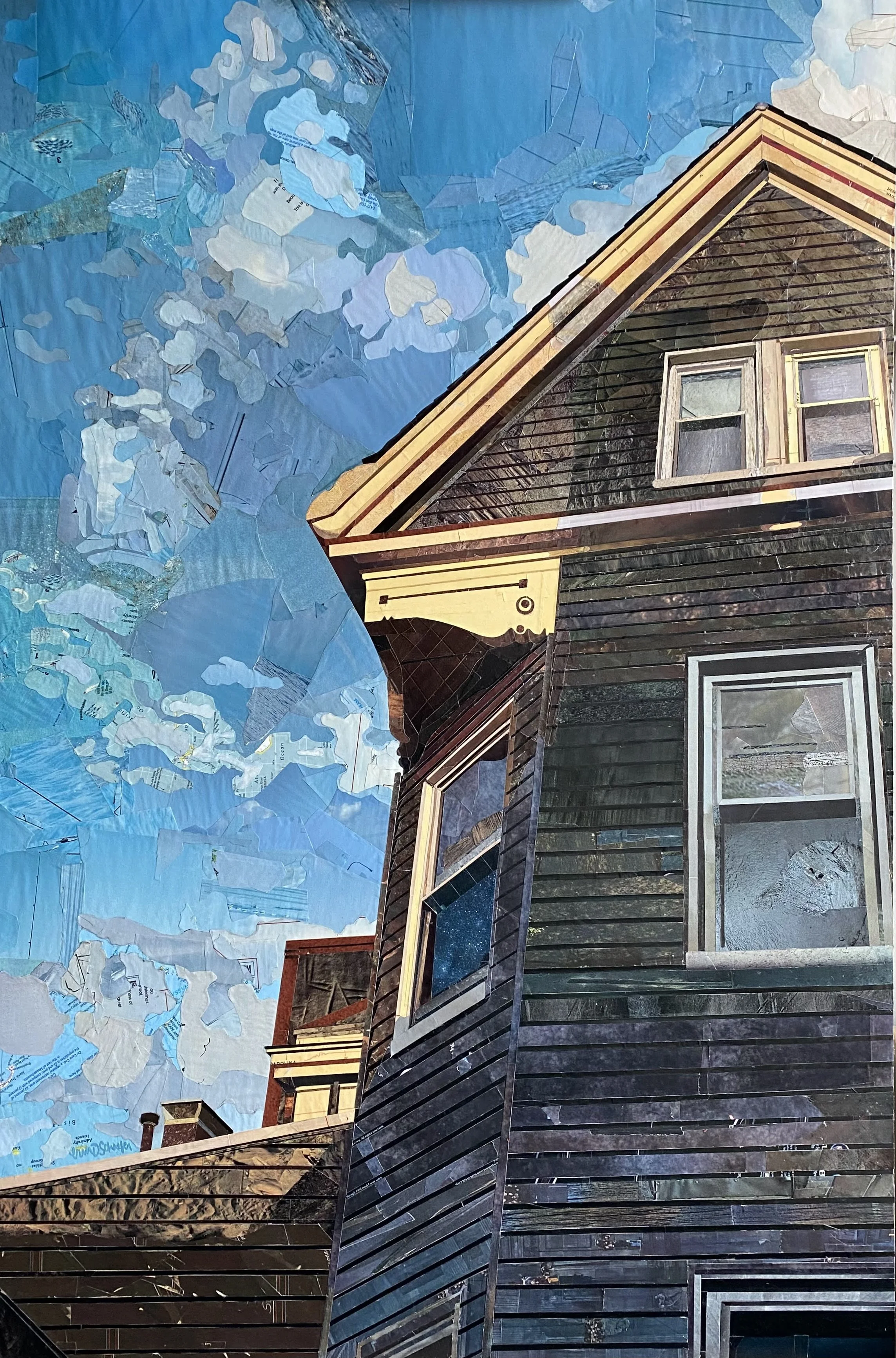 A series of collages depicting windows and suburban scenes that speak to an impersonal American landscape. Without intimate details, all that remains are the architectural elements and the defining moments of light and darkness. The warm light and long shadows add a temporal element, signifying the setting of one stage and the rising of another. The materials give a sense of anonymity; the magazine pages depict an array of places and moments in time – memories that are not my own. The result is a quiet, contemplative look outside into the surrounding framework that feels simultaneously familiar and distant.