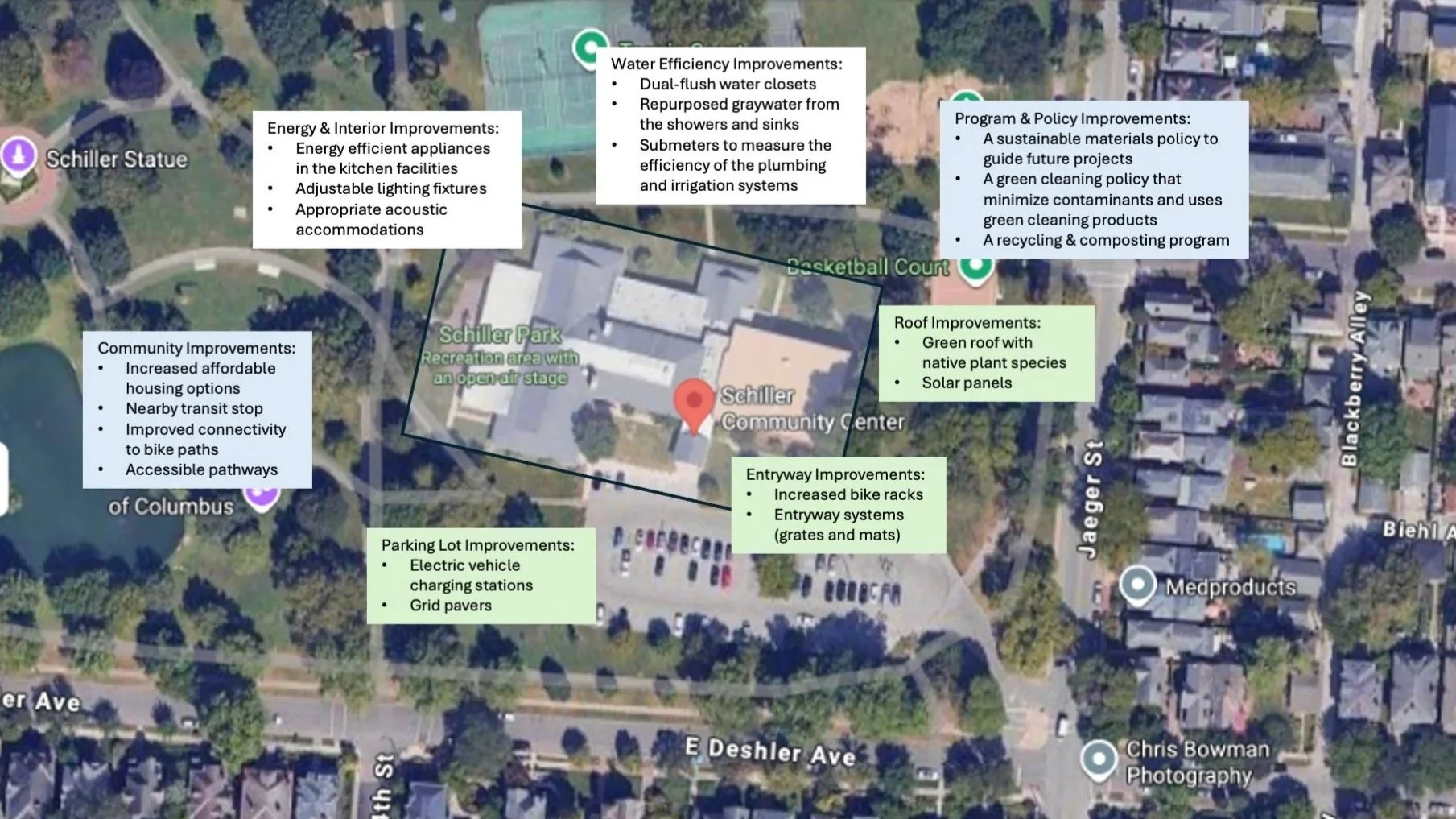 A list of practical recommendations for Columbus’ Schiller Recreation Center to improve its sustainability and longterm functionality. These green building methods were strategically selected to position the facility as LEED-certified. The focus on environmentalism is fitting for a community center, as this is a place for conscious improvement, gathering, and collaboration.